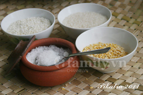 Đãi sạch gạo nếp, gạo tẻ, đậu xanh (riêng biệt từng thứ một). Ngâm nước khoảng 15-20 phút. Sau khi đã ngâm xong, để gạo nếp, gạo tẻ, đậu xanh ra từng rổ riêng biệt, để thật ráo nước. Sau khi đã ráo nước, lần lượt cho từng thứ vào chảo khô để rang chín (không rang vàng) trên lửa nhỏ. Đậu xanh có thể rang đến vàng cho thơm