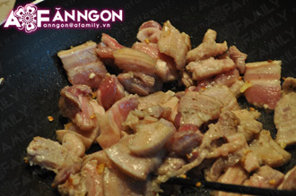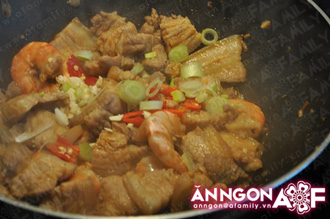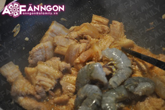 ... thì bạn thêm tôm vào xào cùng khoảng 3 phút, nêm nước mắm và một ít đường. Cho nước sôi xâm xấp mặt thịt, đun sôi trở lại trong khoảng 5 phút.
