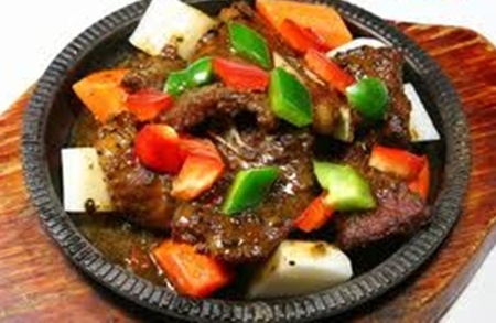 - Cho thịt bò lên đĩa hành tây và ớt Đà Lạt.