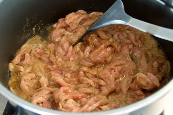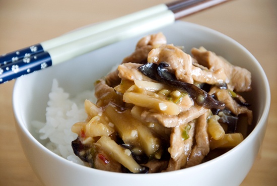 Thêm thịt heo cùng nguyên liệu (C) đã trộn đều từ trước vào đảo cùng đến khi sốt đặc sệt lại thì bạn nêm nếm lại lần cuối và cho thịt ra đĩa, dùng với cơm nóng: