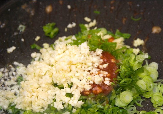 Tiếp tục cho 1 thìa canh dầu ăn vào chảo, để lửa vừa, đợi tới khi dầu ăn nóng bạn cho các nguyên liệu ở phần (B) vào đảo trong khoảng 1 phút: