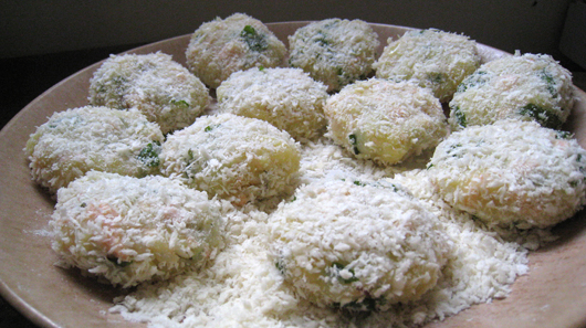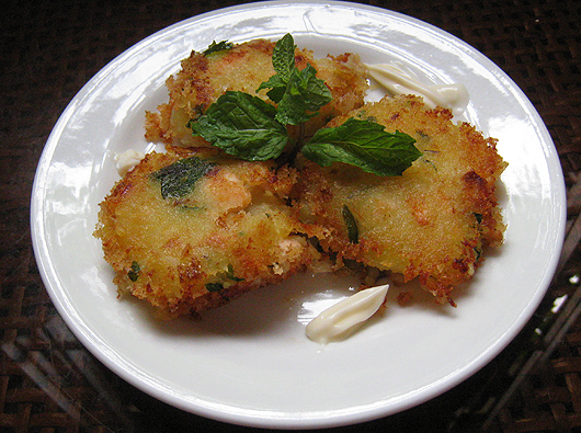 Thành phẩm sau khi các viên bánh được rán vàng trong chảo đây, bánh này ăn nóng với sốt mayonnaise.