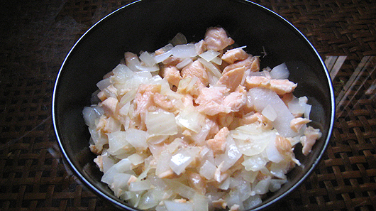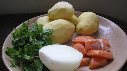 Hành tây và cá hồi cắt nhỏ xào thơm lên, khoai tây luộc rồi dầm nhuyễn, lá bạc hà cắt nhỏ, tất cả trộn đều với chút muối và tiêu.