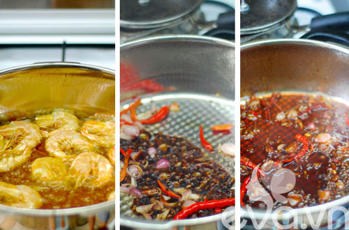 - Tôm làm sạch cho ngập dầu trong chảo, chiên cho thật vàng đều rồi gắp tạm tôm ra đĩa.