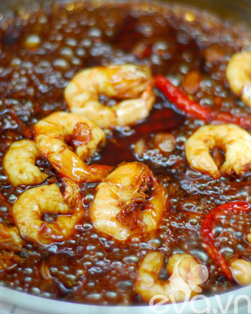 - Cho tôm đã chiên vào đảo đều, đến khi nước sốt cạn sền sệt là được.