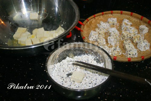 Nhúng đậu phụ vào lòng đỏ trứng gà rồi lăn qua hỗn hợp bột, vừng: