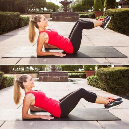 Bạn nằm trên tư thế đầu gối hơi cong lên, bàn chân song song với mặt đất, hai tay chống đỡ cơ thể với lòng bàn tay hướng xuống dưới sàn nhà. Khi có trọng tâm nâng đỡ cơ thể, bạn nâng chân lên một góc 90 độ, mũi bàn chân hướng thẳng. Từ từ đưa chân của bạn hạ thấp xuống sao cho cơ thể tạo thành chữ U với phần đầu gối. Luyện tập động tác khoảng 20 lần lên xuống mỗi lần.