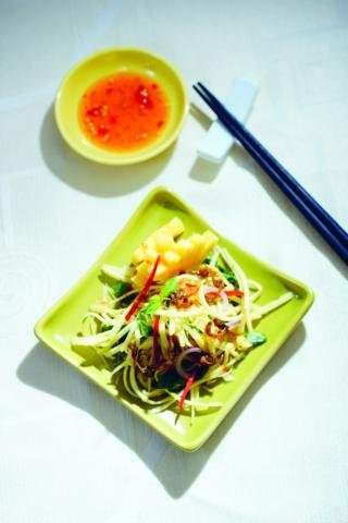 Thưởng thức: Trộn đều cá với gỏi. Ăn kèm với nước mắm chua ngọt.