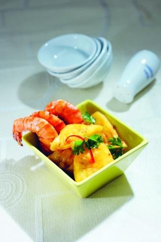 Phi thơm hành tỏi. Cho tôm, thơm, gia vị vào, để lửa nhỏ cho tôm thấm gia vị và màu sắc đậm đà hơn.