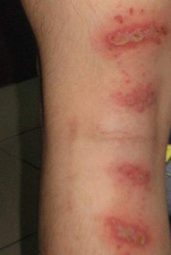Viêm da tiếp xúc liên quan đến côn trùng, nhất là do tiếp xúc với kiến ba khoang thường xuất hiện ở các vùng da hở, người bệnh thường có biểu hiện bỏng rát da, phồng rộp đã nhầm tưởng là bệnh zona nên tự đi mua thuốc điều trị. Đã có những người bôi thuốc acyclovir vào các vết dị ứng dẫn đến loét da, tổn thương da nặng, phải nhập viện điều trị. Nguy hiểm nhất là các đối tượng trẻ nhỏ bởi làn da của trẻ mỏng nên rất dễ bị tổn thương.