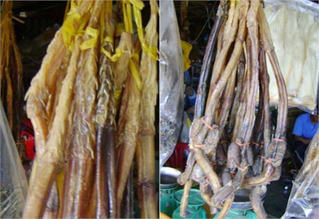 Theo ông Kha, pín bò được sấy khô, thêm màu mè cho có hình thù lạ mắt là đã thành pín hải cẩu. Riêng phần đầu pín tua tủa gai là do người bán dùng mấy rễ cây đẽo gọt cho tua tủa rồi treo bán, quảng cáo đó là pín hải cẩu!