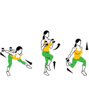 - Ấn đầu gối chân trước xuống và nâng cao đầu gối để đứng thẳng người, hai tay gập lại đưa lên ngang vai.
