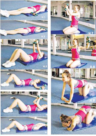Tư thế chuẩn bị, 2 chân co, khép. 2 tay cầm tạ, khuỷu tay hơi gấp lại và hướng ra trước ngực, 2 tay kéo tạ chậm qua đầu, khuỷu tay vẫn co. Trở về tư thế chuẩn bị. Thực hiện 12 lần. Khi kéo tạ qua đầu hít sâu bằng mũi, trở về thở ra bằng miệng.