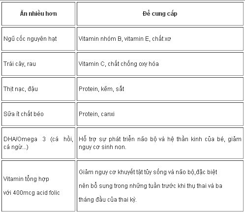 - Bổ sung Choline: Choline là một chất dinh dưỡng có khả năng làm giảm các gene có hại gây dị tật bẩm sinh ở thai nhi. Nó cũng có vai trò quan trọng cho sự hoạt động của não bộ. Nhưng hầu hết chị em phụ nữ không có đủ choline, nhiều loại vitamin bổ sung trước khi sinh không chứa chất này. Tuy nhiên, bạn vẫn có thể bổ sung dưỡng chất quan trọng này từ lòng đỏ trứng, gan bò, súp lơ và các loại rau xanh.