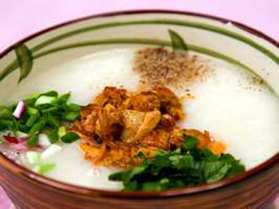 Cháo gà nhân sâm: gà mái 1 con 600 - 700g, nhân sâm 5g, gừng tươi 3 - 4 lát, gạo tẻ ngon 50g, gia vị vừa đủ. Gà làm sạch lông, bỏ nội tạng, nhân sâm thái lát mỏng, gừng rửa sạch thái lát, đập giập. Cho gà, gạo, nhân sâm vào nồi, đổ nước vừa đủ, đun to lửa cho sôi rồi hạ lửa nhỏ nấu thành cháo. Khi cháo chín nhừ cho gừng vào trộn đều, cho sôi lại, nêm gia vị, ăn nóng. Mỗi tháng nên ăn khoảng 20 lần, ăn trong 2 tháng liền.