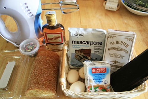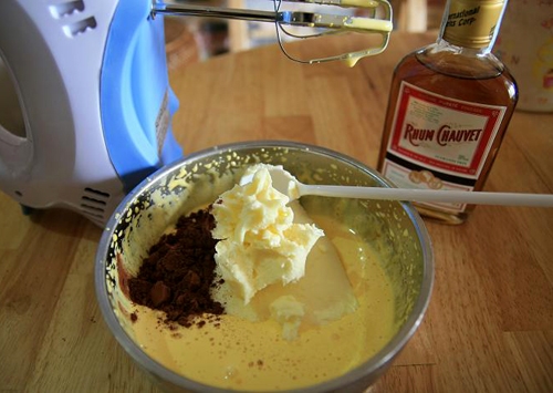 - Sau đó cho thêm mascapone, rượu rum, 3 thìa bột cacao, rồi tiếp tục đánh đều.