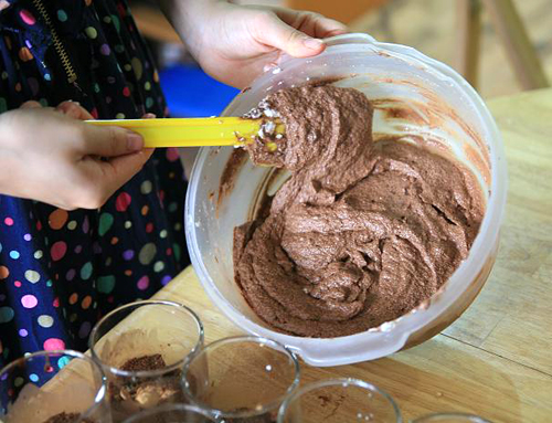 - Phủ lên trên 1 lớp kem tươi chocolate vừa trộn, cứ một lớp bánh, lại một lớp kem.