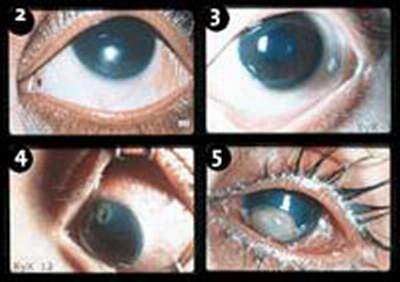 Quáng gà là triệu chứng sớm nhất của bệnh thiếu vitamin A, với biểu hiện: trẻ hay bị vấp ngã, đi quờ quạng khi chiều tối. Khô kết mạc thì trẻ hay chớp mắt, lim dim, thường cả hai mắt, kết mạc bị xù xì, vàng, nhăn nheo, có bọt nhỏ, không thấy rõ các mạch máu. Vệt Bitot là những đám tế bào biểu mô kết mạc bị sừng hóa, dày lên thành từng đám và bong vảy, có màu trắng xám nổi lên bề mặt kết mạc nhãn cầu, bề mặt kết mạc phủ một chất như bọt xà phòng hoặc lổn nhổn như bã đậu, hay thấy ở kết mạc nhãn cầu sát rìa giác mạc vị trí 3 giờ và 9 giờ, thường có hình tam giác đáy quay về phía rìa giác mạc. Các tổn thương nói trên hồi phục nhanh nếu được điều trị bằng vitamin A. Khô giác mạc trẻ có các triệu chứng: sợ ánh sáng, chói mắt, hay nheo mắt. Khám thấy giác mạc mất bóng sáng, mờ đi như màn sương phủ. Biểu mô giác mạc bị trợt, nhu mô có thể bị thâm nhiễm tế bào viêm làm giác mạc đục. Có thể có mủ tiền phòng, nhưng vẫn hồi phục hoàn toàn không để lại sẹo nếu điều trị kịp thời. Loét nhuyễn dưới 1/3 diện tích giác mạc là tổn thương không hồi phục của giác mạc để lại sẹo giác mạc và giảm thị lực. Trường hợp loét sâu có thể bị phòi mống mắt để lại sẹo dày, dính mống mắt. Loét nhuyễn trên 1/3 diện tích giác mạc là tổn thương rất nặng, gây hoại tử tất cả các lớp của giác mạc, phá hủy hoặc làm biến dạng nhãn cầu. Có thể toàn bộ giác mạc bị hoại tử, lộ mống mắt ra ngoài, lòi thủy tinh thể và dịch kính ra ngoài, teo nhãn cầu. Sẹo giác mạc là di chứng của loét giác mạc, thường là sẹo rúm ró, màu trắng. Khô đáy mắt là tổn thương võng mạc do thiếu vitamin A mạn tính, thường gặp ở trẻ lớn, lứa tuổi đi học, kèm theo bị quáng gà.