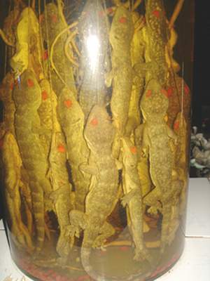 Bài 3: Ngâm rượu tắc kè đơn độc như sau: tắc kè khô 1 hoặc vài đôi, ngâm với 1 lít rượu trắng 35 - 400, có thể thêm trần bì hoặc vỏ cam vào cho thơm, ngâm trong khoảng 1 tháng là dùng được. Lọc lấy rượu trong uống. Ngày uống chừng nửa cốc con (15 - 30ml). Có thể pha với mật ong cho ngọt. Uống vào buổi tối hoặc sáng sớm. Dùng cho những người hay mệt nhọc, đau xương, đau mình, đau ngang thắt lưng do thận yếu.