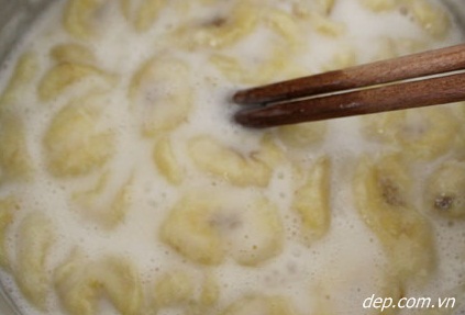 Bước 4: Cho chuối vừa cắt lát vào nồi nước cốt dừa rồi đun tiếp. Nếu bạn thích ăn chín thì đun độ 5 phút, còn mình thì chỉ đun độ 2 phút là vừa miệng rồi.