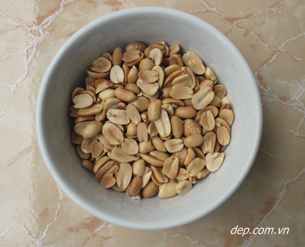 Bước 1: Rang lạc và vừng (nếu hai nguyên liệu này của bạn là nguyên liệu sống). Rang xong tách hết vỏ lạc và cho vào cối giã nhỏ ra nhé.