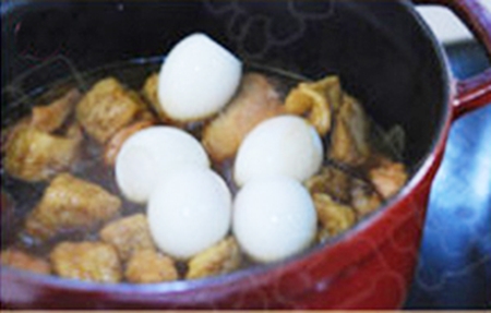 Sau khoảng 15', các bạn cho trứng gà luộc bóc vỏ vào đun cùng.