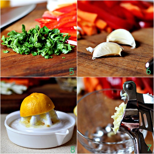 Rau mùi tây rửa sạch, thái nhỏ. Tỏi bóc vỏ, băm hoặc nghiền nhỏ. Vắt lấy nước của nửa quả chanh. Nếu không có chanh vàng bạn dùng chanh xanh thay thế cũng không ảnh hưởng tới mùi vị của món.