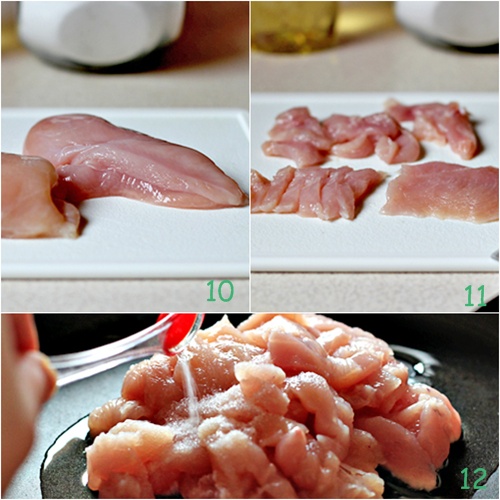Thịt ức gà rửa sạch, thái dạng sợi dày khoảng 2cm.