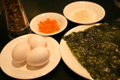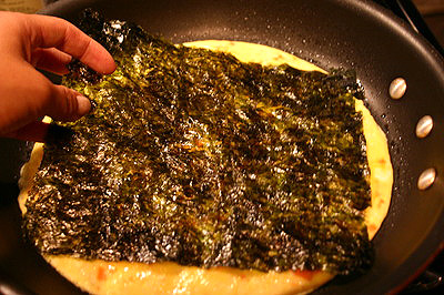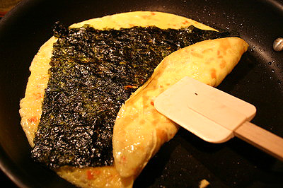 Khi thấy mặt trứng se lại thì đặt một lá rong biển lên, chờ 1 phút.