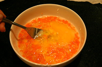 Đập trứng ra bát, cho 1 thìa muối, đánh đều. Hành tây, cà rốt thái hạt lựu cho vào bát trứng, đánh cho các nguyên liệu quyện vào nhau.
