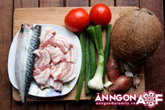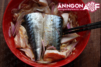 Thịt ba chỉ thái miếng vừa ăn. Cá cắt khúc vừa ăn. Hành, tỏi, gừng xắt nhỏ. Trong một chiếc bát to, trộn hành, tỏi, gừng, tiêu, ớt với nước mắm. Cho thịt ba chỉ và cá vào ướp đều với hỗn hợp này khoảng 15 phút. Rắc chút bột nghệ lên nếu thích.