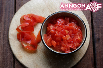 Trong khi ướp cá thì bạn gọt vỏ cà chua (bạn có thể giữ vỏ cà chua lại để làm hoa hồng trang trí). Sau đó cắt hạt lựu hoặc xay nhỏ cà chua.