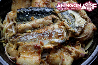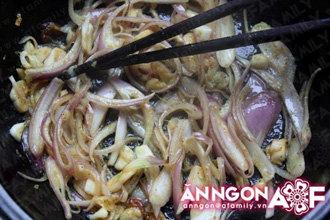 Trút phần dầu rán trong chảo sang nồi đất. Cho nốt hành, tỏi, gừng lúc trước ướp với thịt, cá vào phi thơm.