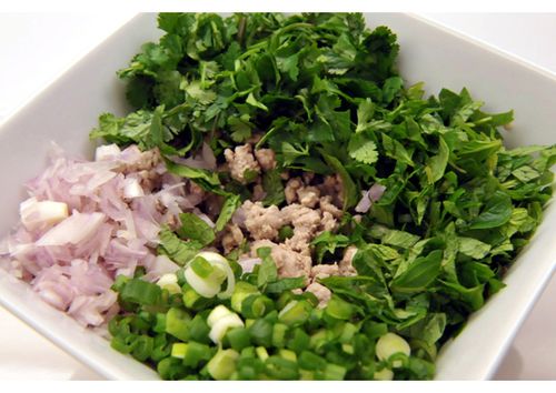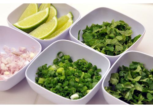 Rau mùi, rau bạc hà, hành lá, hành tím nhặt rửa sạch, xắt nhỏ.